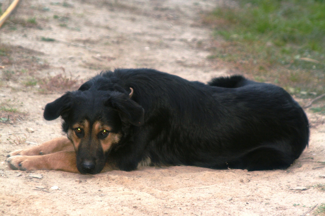 Девочка не очень высокая, около 55 см, но мощная, толстолапая, с густой шерстью, типа метиса овчарки, но с висячими ушами. Совсем молоденькая, ей всего год...